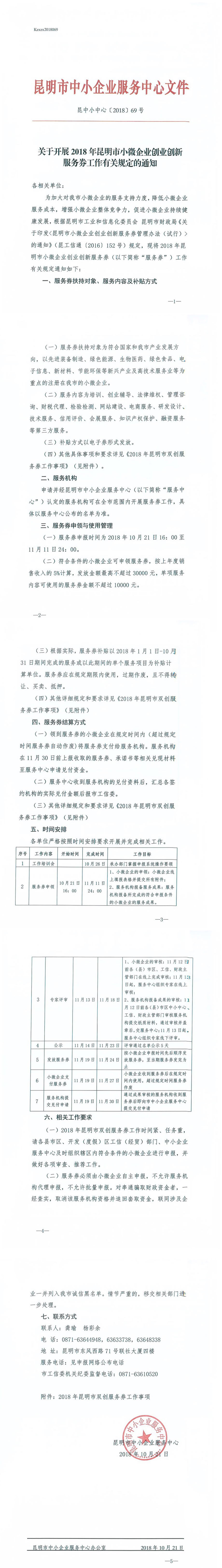 根据昆明市工业和信息化委员会 昆明市财政局《关于印发昆明市小微企业创业创新服务券管理办法(试行)的通知》(昆工信通〔2016〕152号)(以下简称“管理办法”)规定,为顺利完成2018年昆明市小微企业创业创新服务券(以下简称“服务券”)申报、资金兑付等工作,制定如下工作事项。