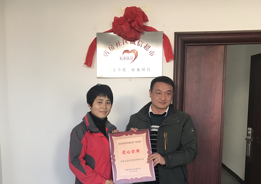 西山区科技局局长王敬红、乌龙镇镇长杨勇、人大主席肖婵姬、西山区扶贫办领导等出席了捐赠仪式。店房村党支部马书记、店房村委会马主任与杨总、宫副总一同对爱心超市进行揭牌。